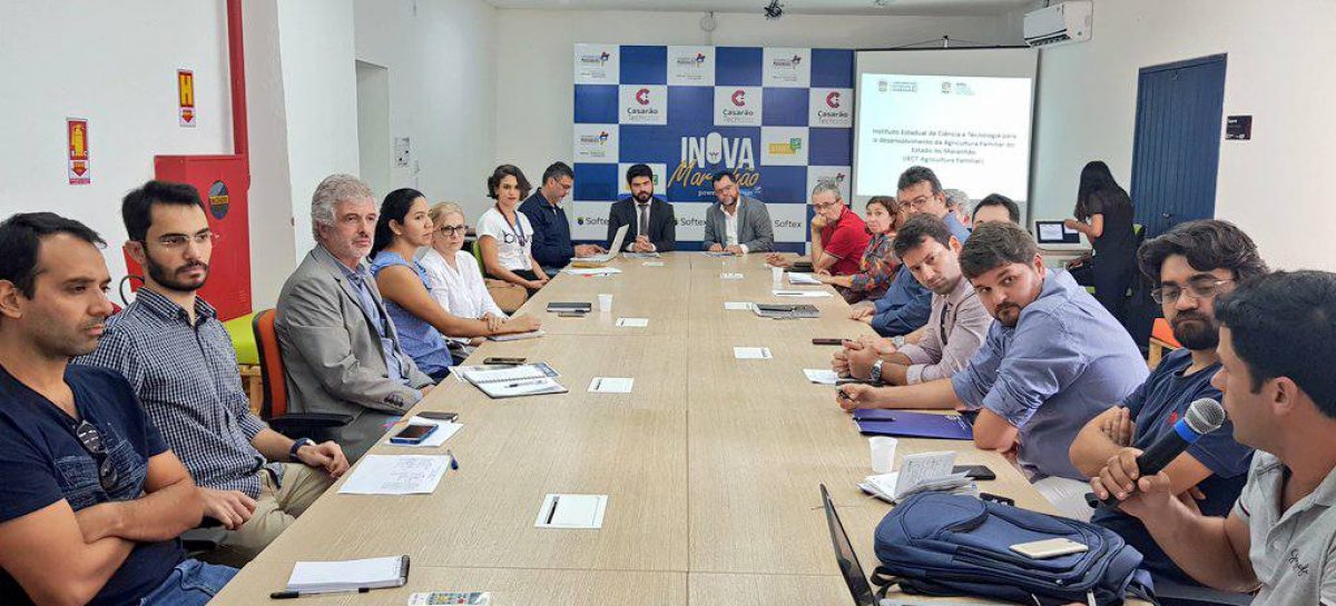 Visando discutir a criação do Instituto Estadual de Ciência e Tecnologia (IECT) – Agricultura Familiar, estão reunidos, no Casarão Tech Renato Archer, os secretários da Secti, Davi Teles e Pedro Igor Nascimento; o presidente, a diretora Científica e a assessora de Planejamento da Fapema, Alex Oliveira, Silvane Magali Nascimento e Aline Nunes, e representantes de diversos institutos de educação superior do Maranhão.