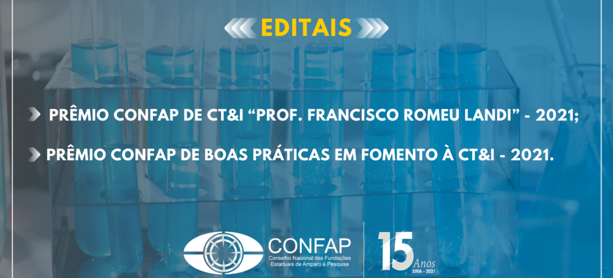 O Conselho Nacional das Fundações Estaduais de Amparo à Pesquisa – Confap, lançou na quinta-feira, (17/06), os editais nº 01/2021 – Prêmio CONFAP de Ciência, Tecnologia & Inovação – Professor Francisco Romeu Landi e nº 02/2021 – Prêmio CONFAP de Boas Práticas em Fomento à Ciência, Tecnologia & Inovação.