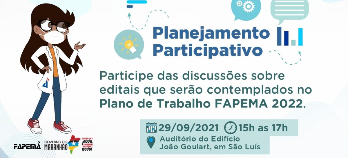 Dando continuidade à ação que visa o planejamento participativo na definição dos editais que serão contemplados no plano de Trabalho 2022, a Fundação de Amparo à Pesquisa e ao Desenvolvimento Científico e Tecnológico do Maranhão (Fapema) promove reunião com professores e pesquisadores do Instituto Federal de Educação, Ciência e Tecnologia do Maranhão (IFMA) e da Universidade Estadual do Maranhão (UEMA) nesta quarta-feira, 29, às 15h, no auditório do Edifício João Goulart, Centro de São Luís.