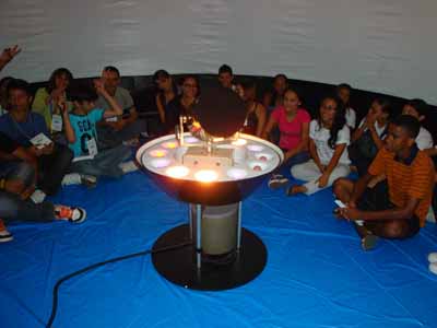 Planetário- Na estrutura inflável do planetário AsterKyanos, os visitantes  viajam pelo ciclo de atividade solar, pela passagem da Terra por órbitas cometárias ou mesmo acompanhar o bombardeamento de nosso planeta por meteoróides.  Cada sessão poderá ter no máximo 40 pessoas, em horários pré-fixados.foto_planetario2