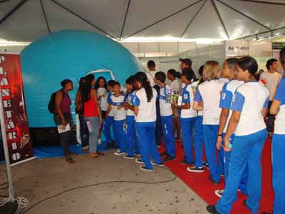 foto_planetarioUm planetário inflável, com 5m de diâmetro e 3,1m de altura, é uma das principais atrações da I Mostra Científica do Maranhão, aberta nesta quarta-feira, 20, e que se estenderá até sexta-feira, 22, das 9h às 18h na Praça Maria Aragão. O evento é promovido pela Fundação de Amparo à Pesquisa e ao Desenvolvimento Científico e Tecnológico do Maranhão (FAPEMA), em parceria com a Universidade Federal do Maranhão (UFMA), Universidade Estadual do Maranhão (UEMA), Centro Universitário do Maranhão (UniCEUMA), e apoio da Vale e Secretaria Estadual de Educação.